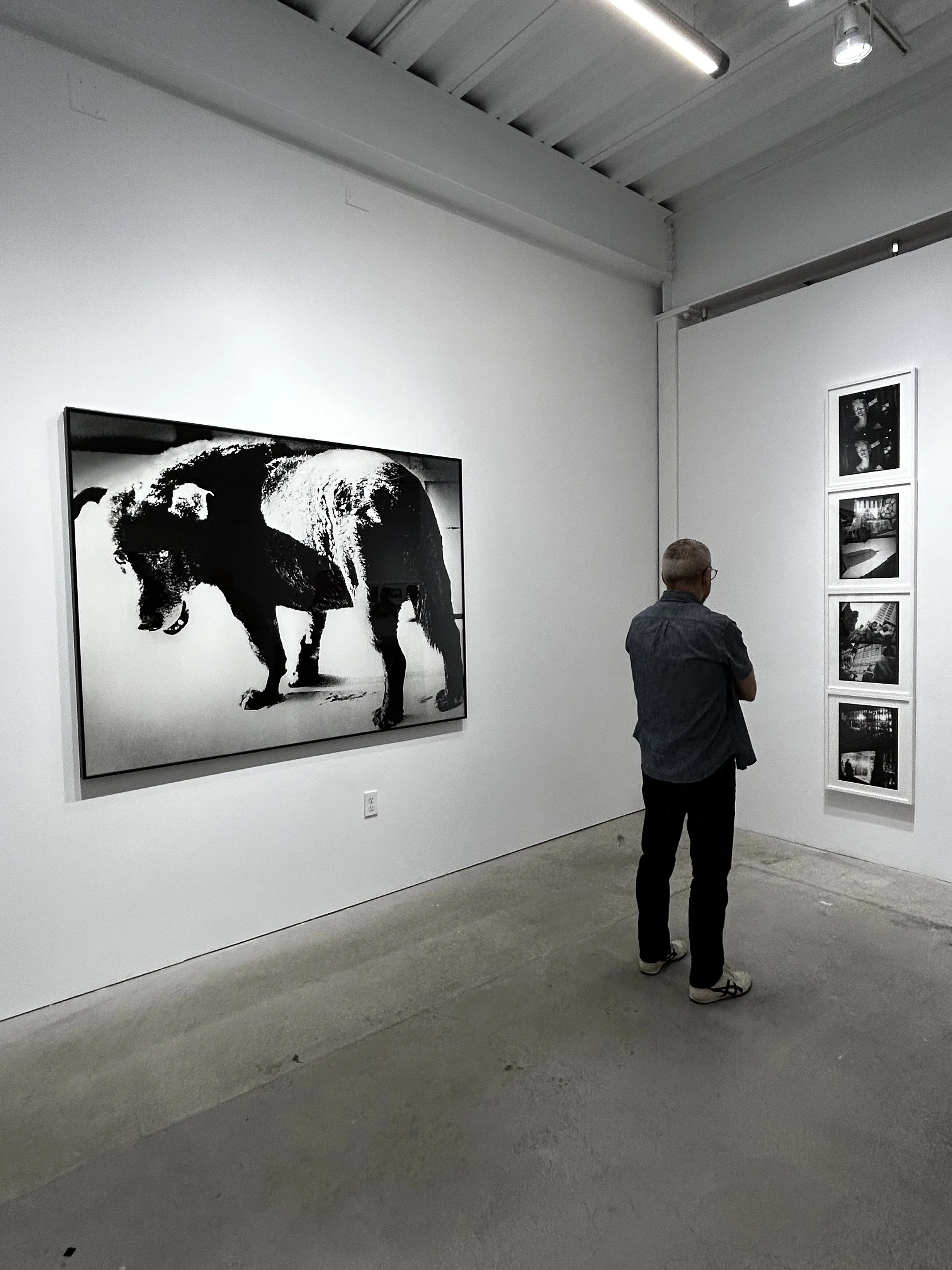 Dog and Man presents a selection of Moriyama’s early Provoke-era pictures. They depict Tokyo’s bustling and gritty streets and alleys, women’s legs in fishnet tights photographed in closeups that approach abstraction, and people young and old adapting in the aftermath of a war that irrecoverably opened and changed their society in ways shocking and thrilling. Centering the show is a mural-size gelatin silver print of what is perhaps Moriyama’s most famous and enigmatic image, “Stray Dog,”